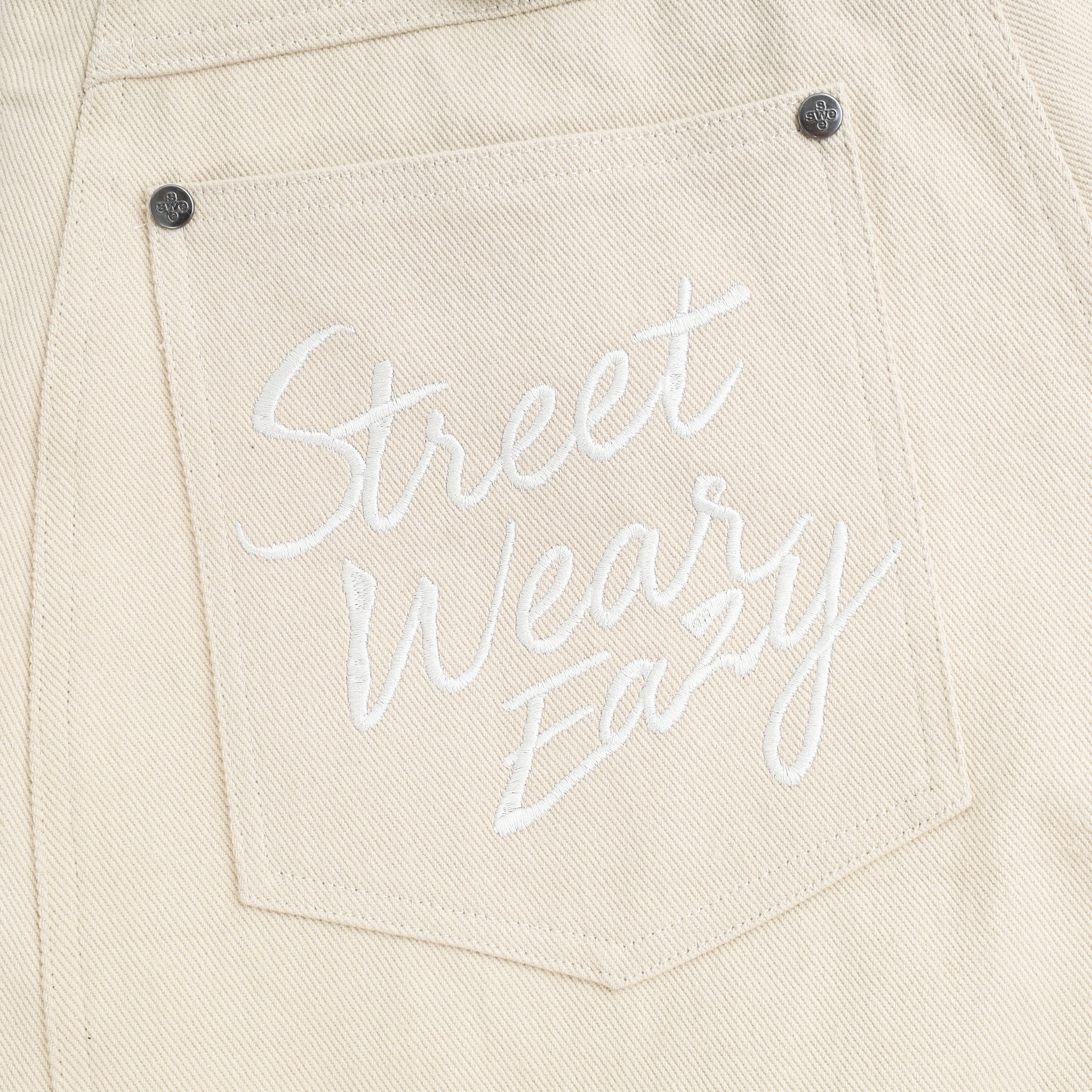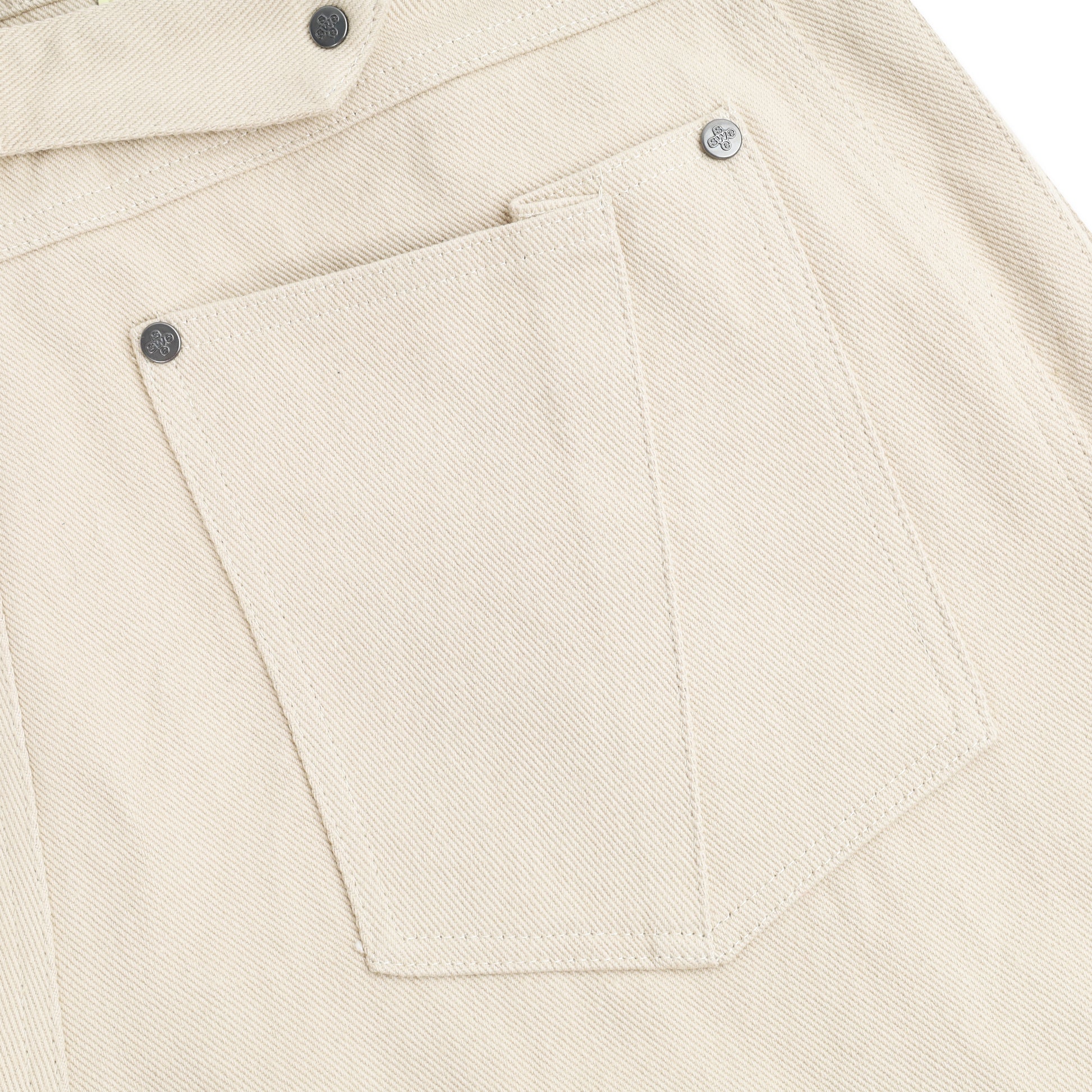 BELTED WIDE PANTS – Khaki pants designed with a straight, relaxed silhouette and pleated details that create a clean, structured look. The pants feature two practical side pockets, while the back includes an adjustable belt strap that allows easy waist adjustment for a more flexible fit. A subtle highlight comes from the SWE logo embroidered on the back pocket, adding a refined brand signature.
