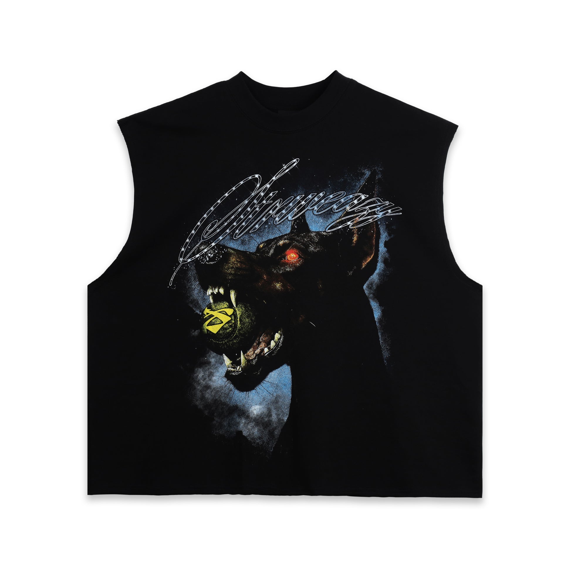 DOBERMAN CUT TEE - The new T-shirt has an impressive design with the sleeves on both sides cut off. The highlight of the shirt is the front pattern using sharp trame printing technique combined with a leather tag attached on the back to create a subtle highlight and a strong SWE mark.