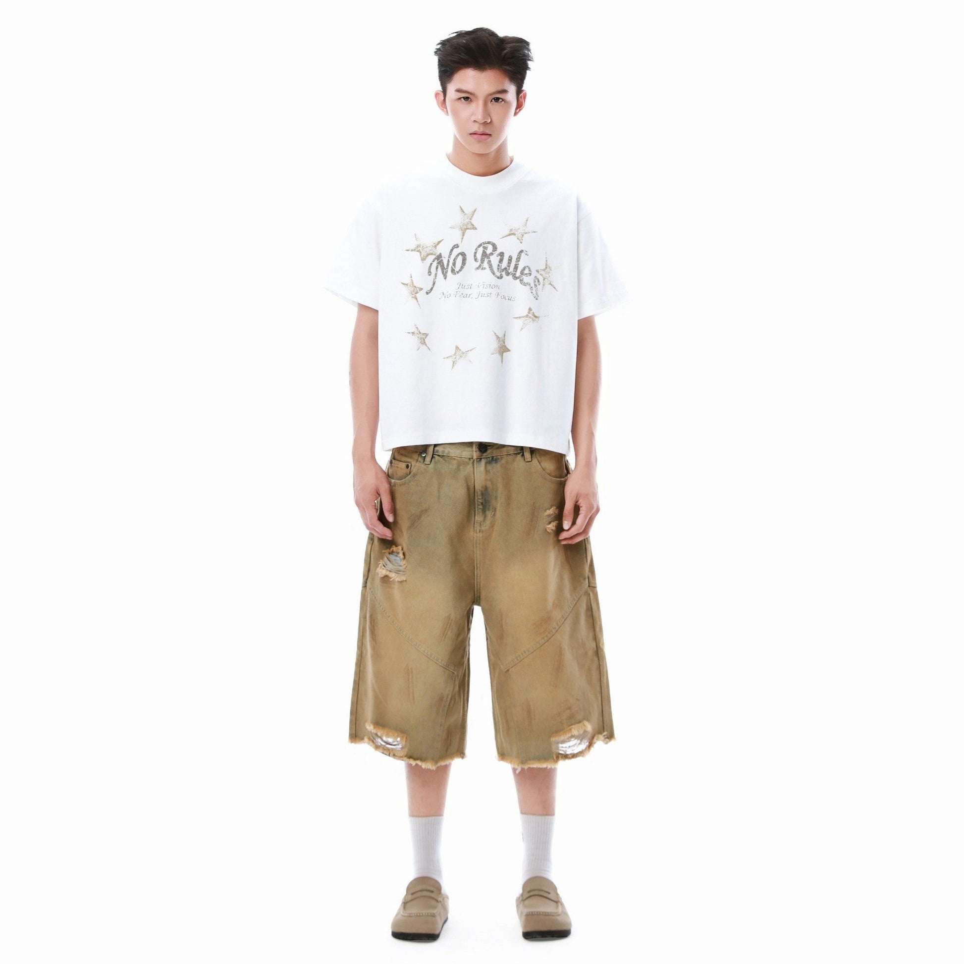RULELESS BOXY TEE - The new T-shirt is impressively designed with the highlight of the shirt being the Typography message pattern printed on the front with sharp Trame combined with eye-catching star patterns. The back is simple with SWE's new leather tag delicately attached.