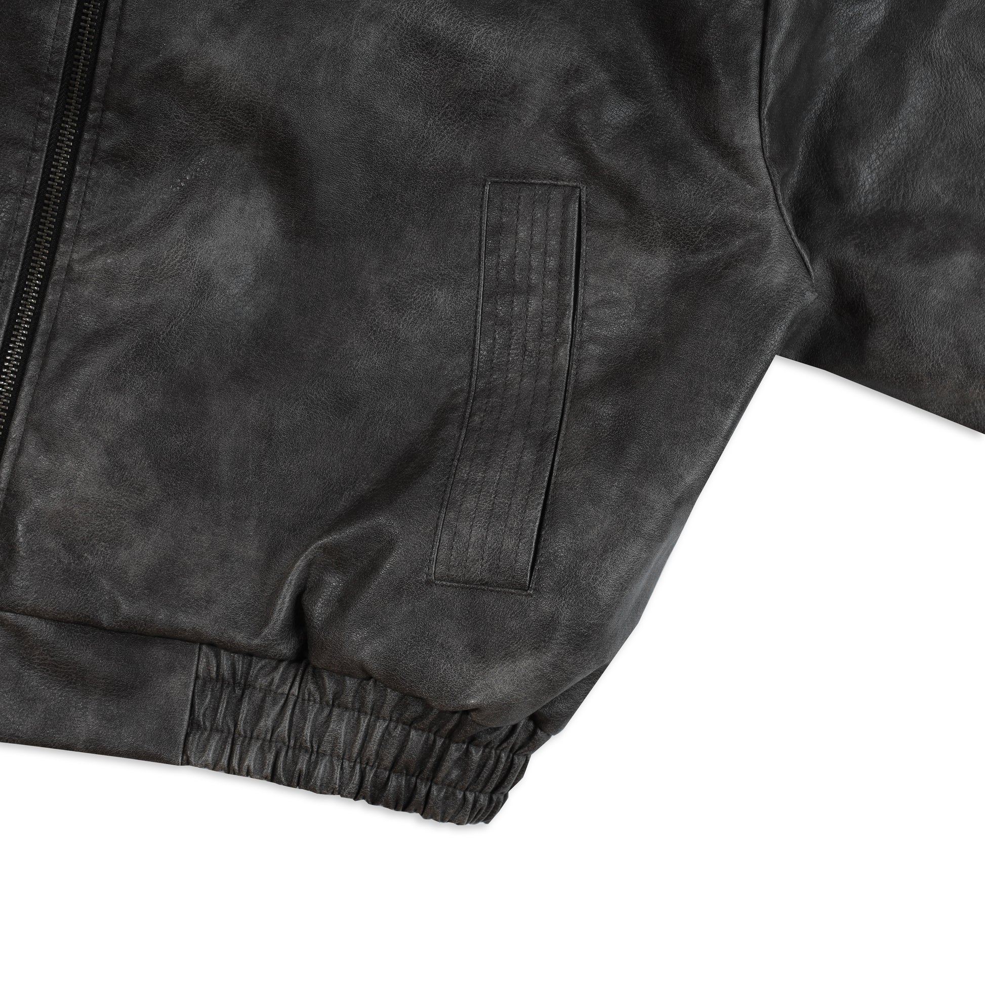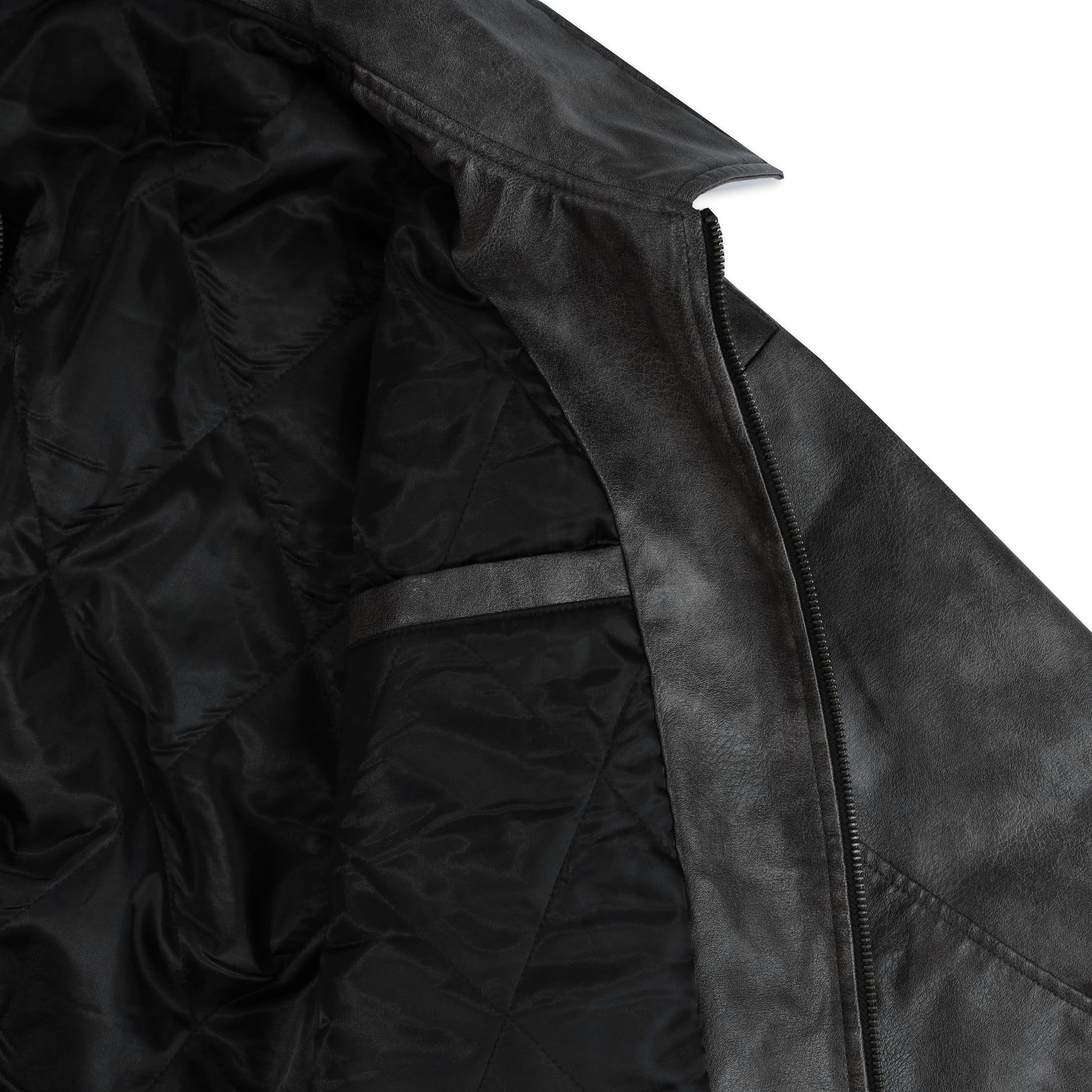 The SWE jacket is made from 100% PU Leather with a weight of 370gsm, offering a thick and structured leather surface. The inside is lined with quilted AC padding for added warmth, along with an inner pocket for conveniently carrying personal items.