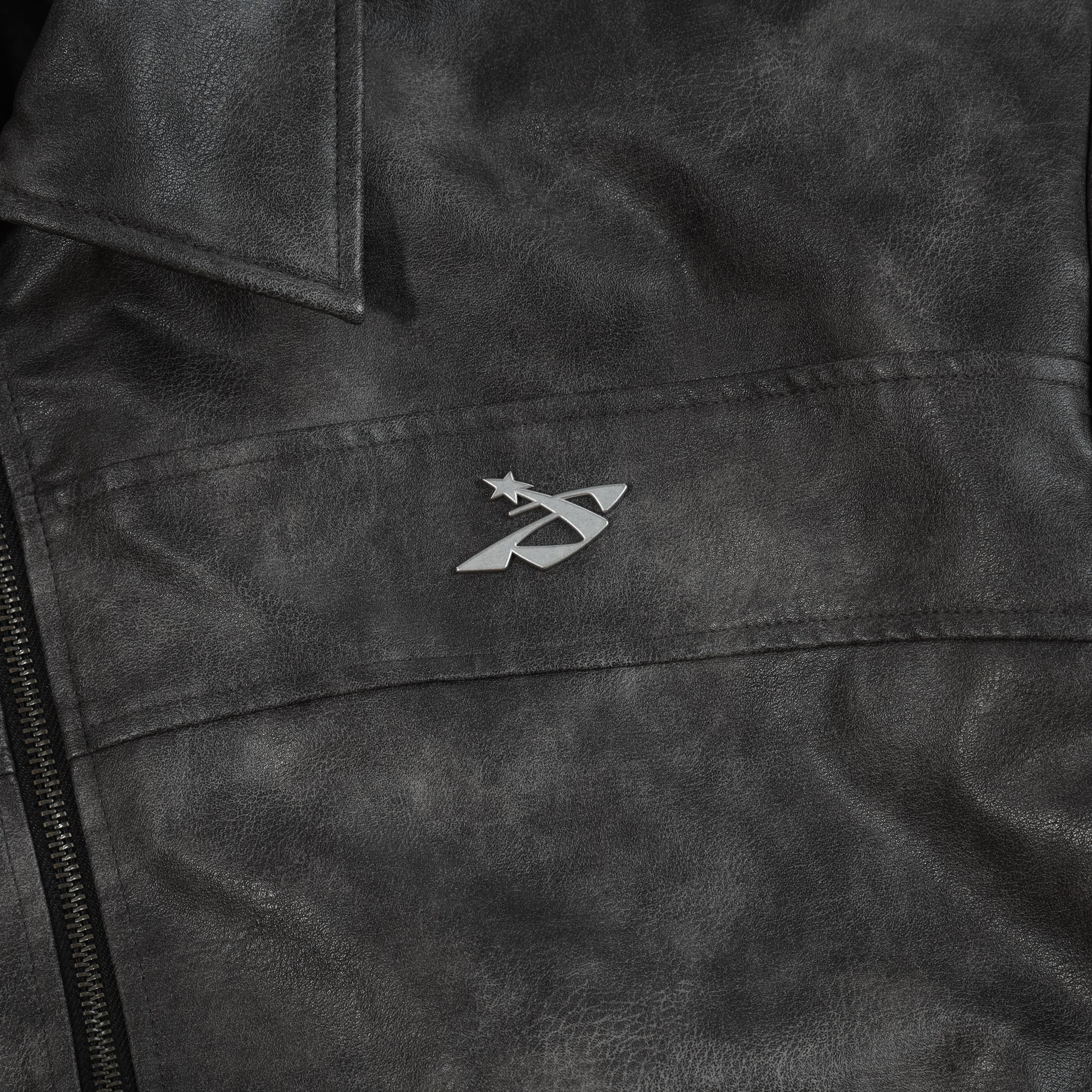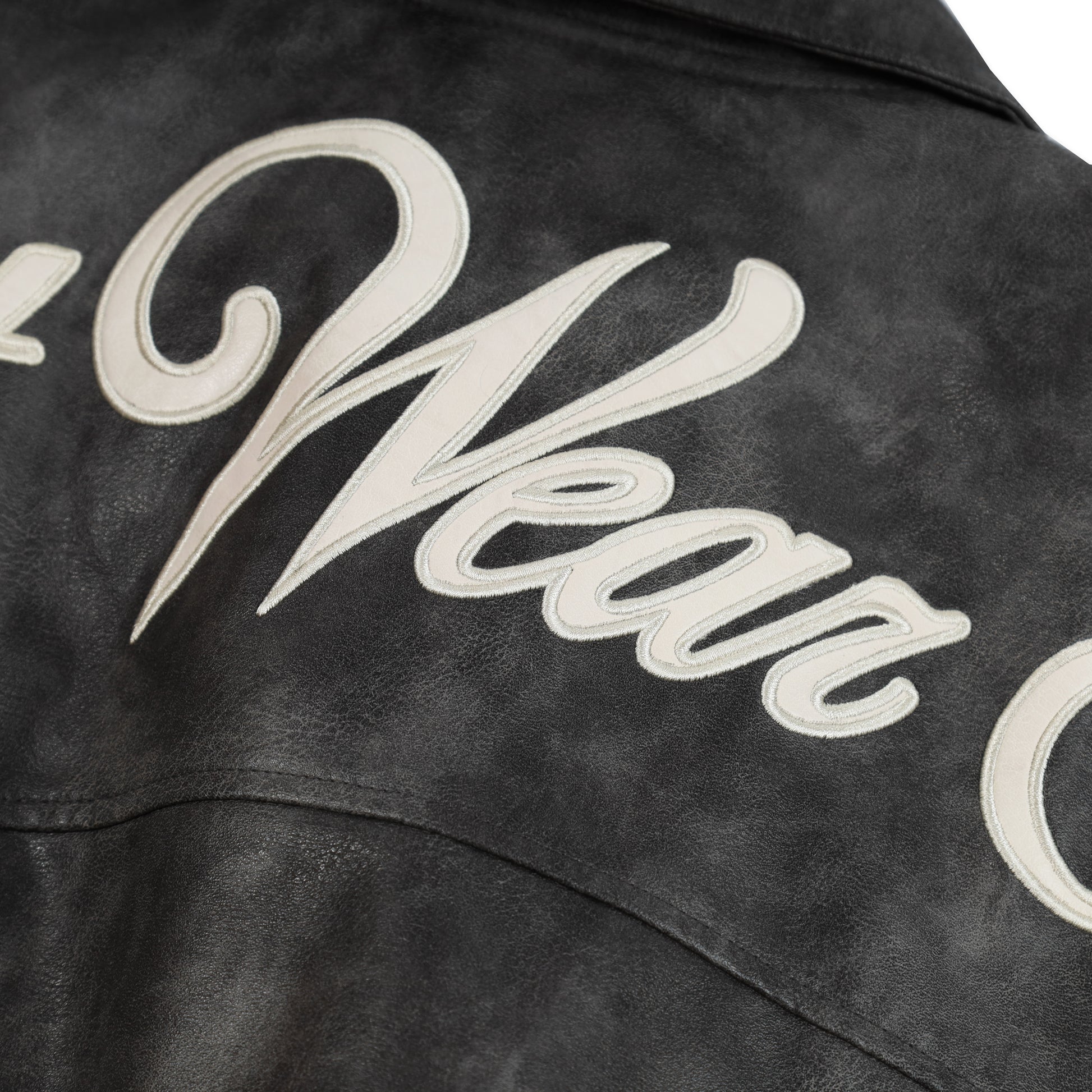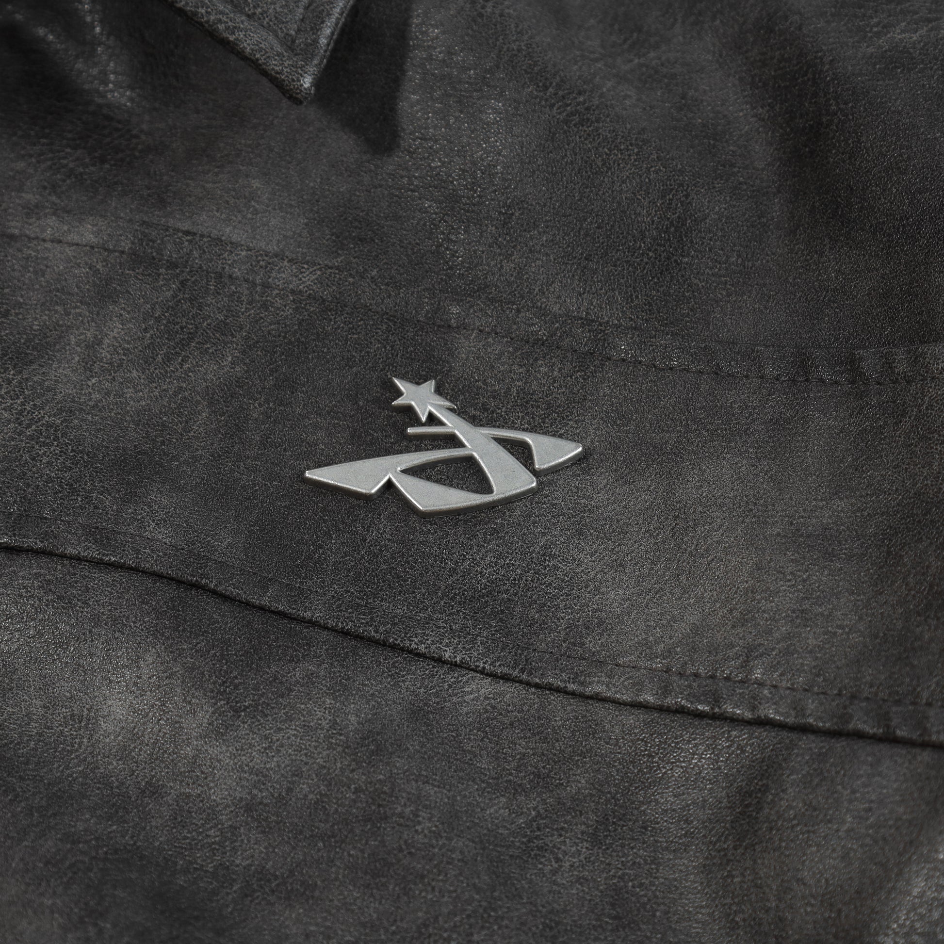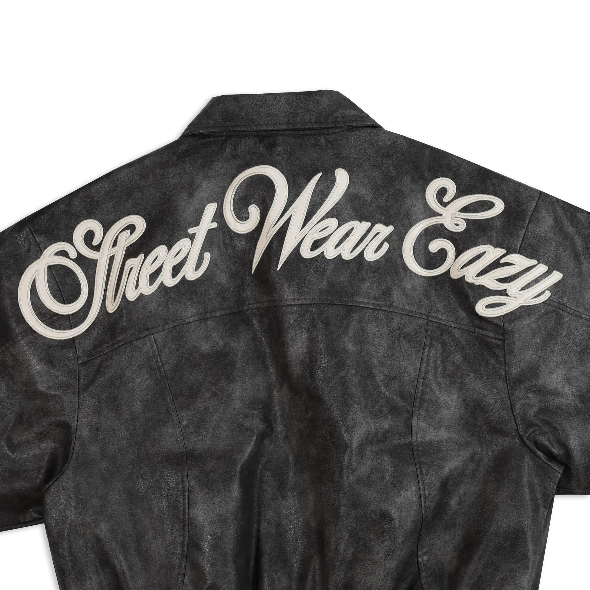 STONEWASHED LEATHER JACKET – A leather jacket designed in a bomber boxy silhouette, delivering a bold and rugged aesthetic. The jacket features panel seam constructions that enhance the structured shape, combined with a metal logo detail on the front for a distinctive touch. The back is finished with a SWE leather appliqué embroidered logo, completing the design with a modern streetwear attitude.
