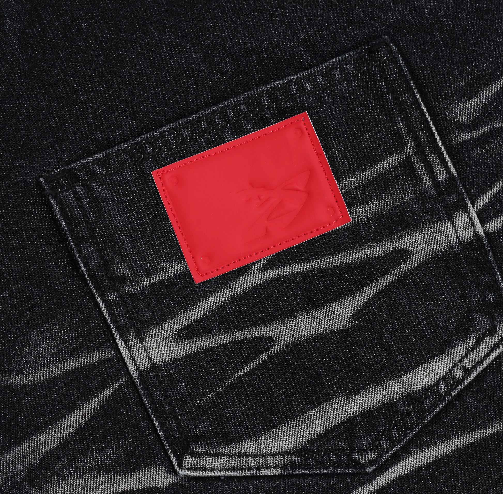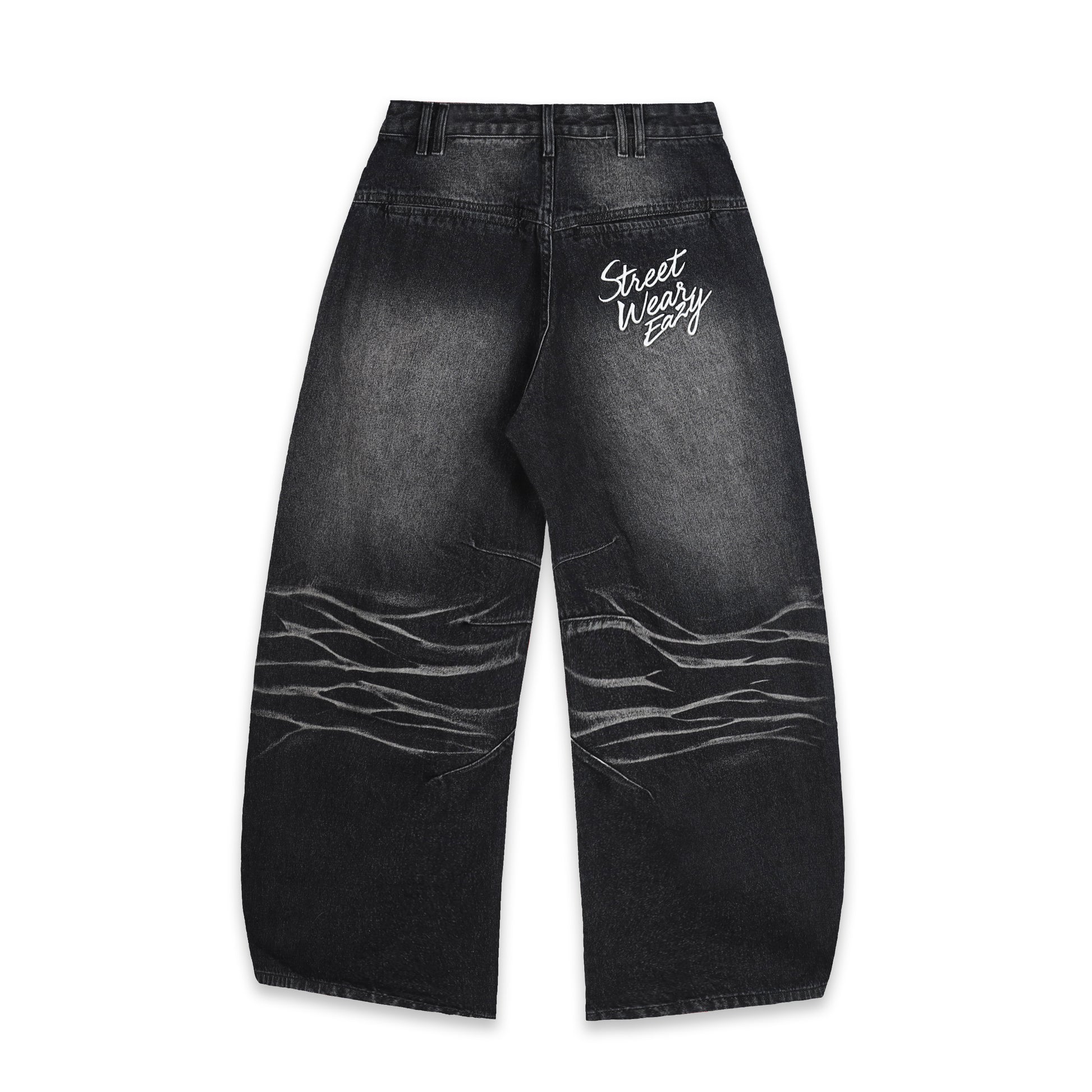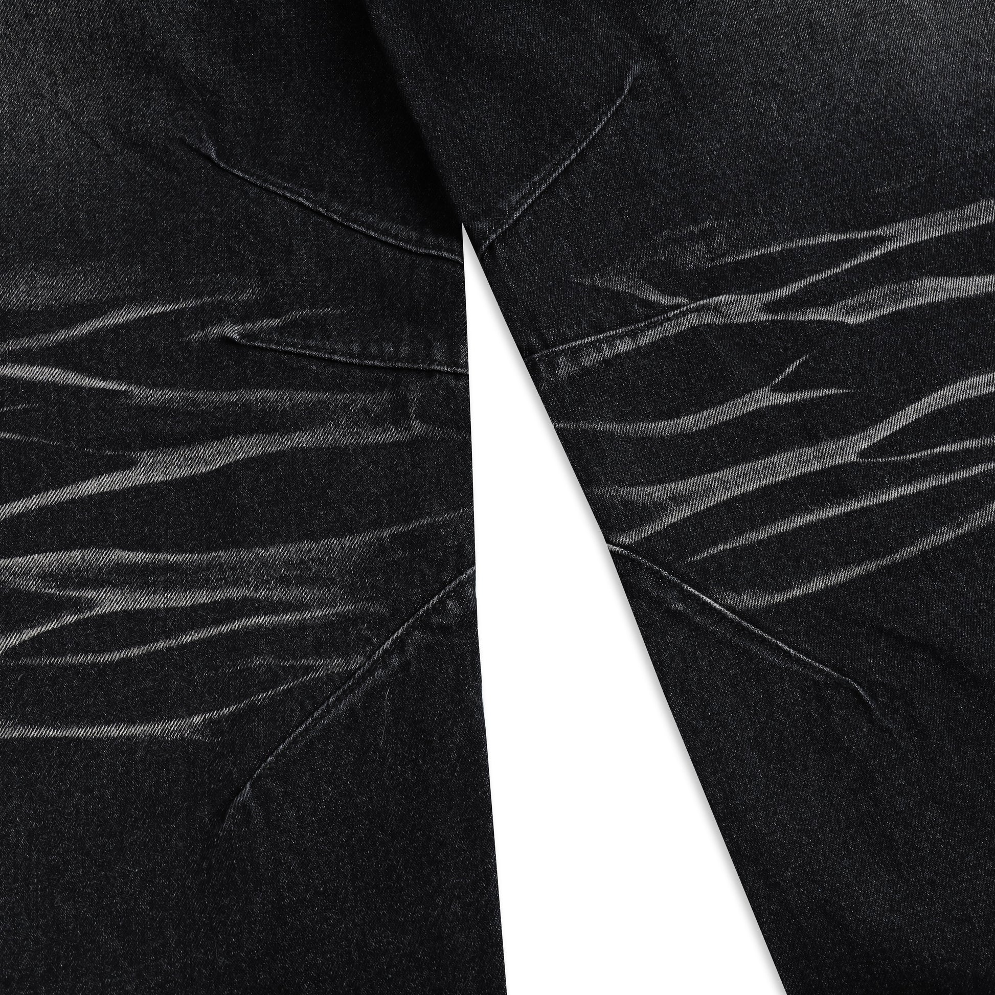 WHISKER JEANS – These jeans feature a wide, curved-leg silhouette that reflects a bold and rugged streetwear aesthetic. The denim is treated with a washed finish and enhanced with 3D PP whisker spraying, creating a natural texture and added depth across the surface. A key highlight is the decorative twisted seam detailing running throughout the design, giving the jeans a distinctive and edgy character.